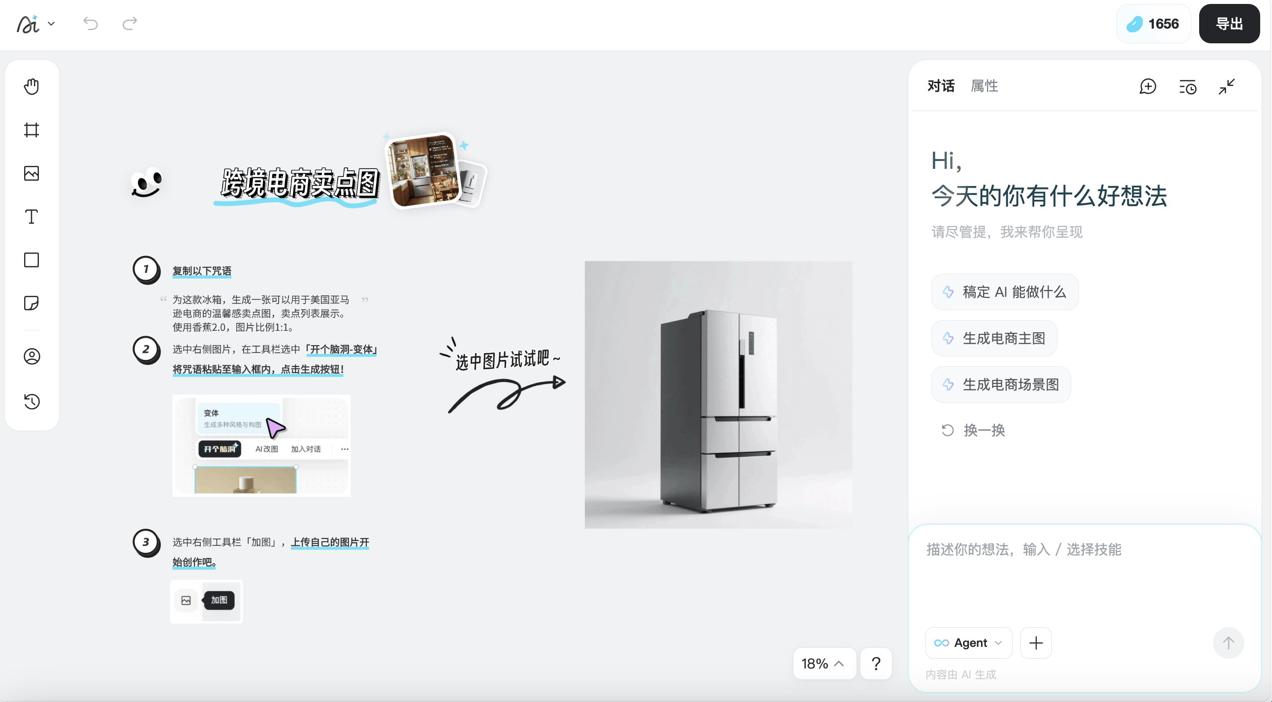 它将帮力您的商品正在千帆竞发的市场中脱颖而出,这里汇聚了大量由AI智能生成或用户分享的优良卖点图案例,AI便能精准地施行点窜。即便是AI智能生成的图片,保守的设想流程往往冗长而繁琐。